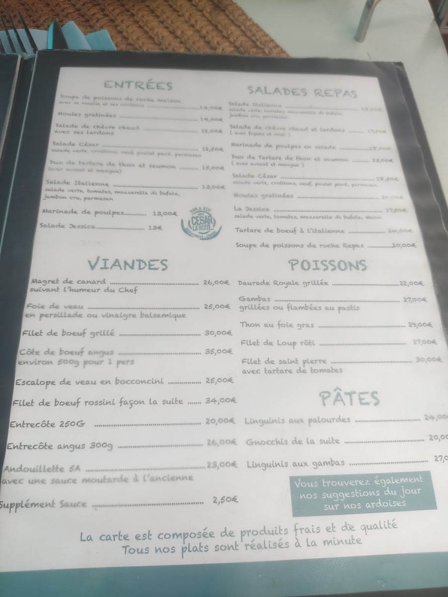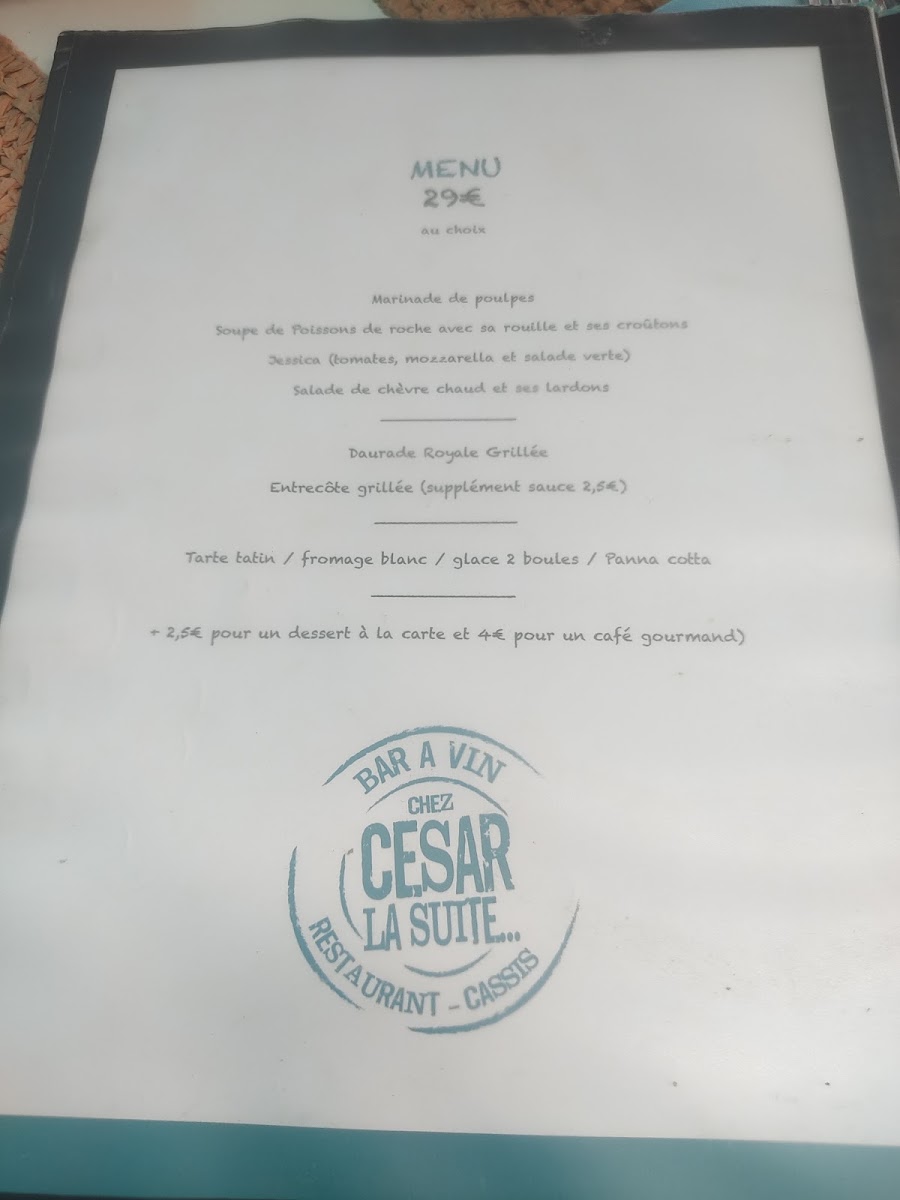 Welcome to Cesar la Suite, an exquisite culinary destination nestled at 9 Quai des Baux, Cassis, France. This charming eatery boasts not only stunning waterfront views but a menu that is both creatively inspired and refreshingly simple. The highlight of the offerings includes a delightful Chicken Caesar Salad, perfect for a sunny lunch, and the innovative Hamburger Fish & Chips, a unique take on a classic that features crispy breaded fish accompanied by golden fries.